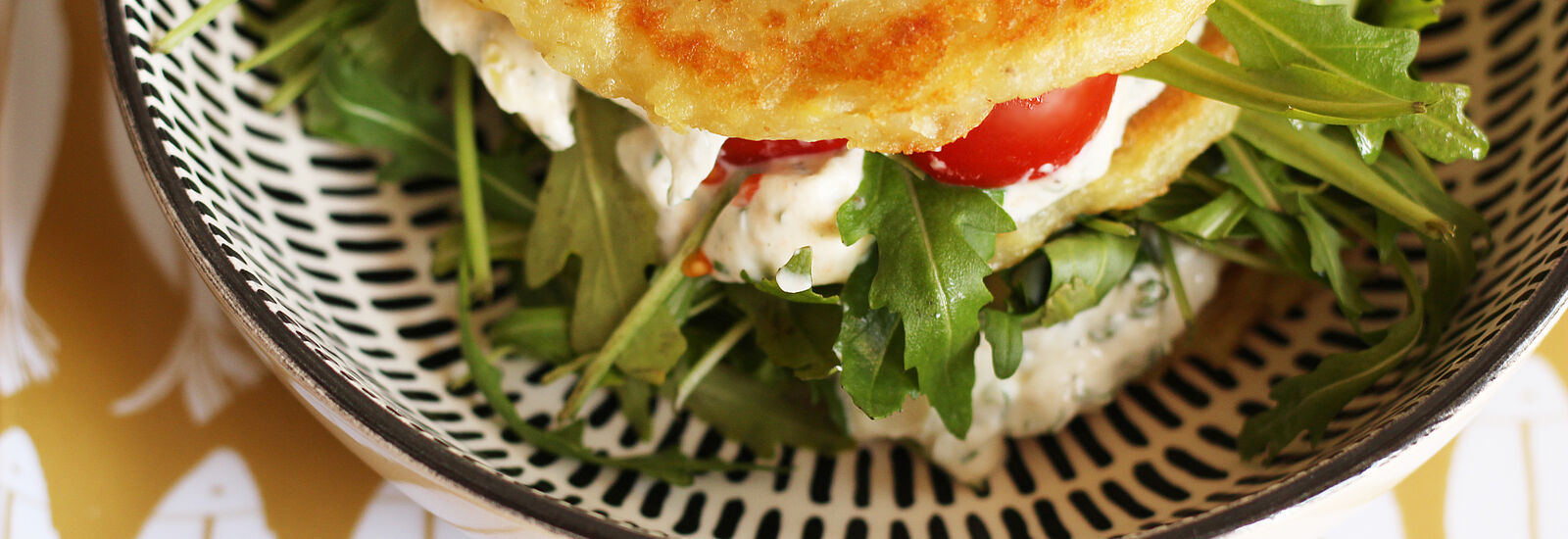 Nun bereite die tiefgekühlten Thüringer Kartoffelpuffer nach Packungsanleitung zu. Lege dann den ersten Kartoffelpuffer auf einen Teller und streiche etwas von der Quarkcreme darauf. Nun bedeckst du diese mit einem zweiten Kartoffelpuffer, bestreichst auch diesen mit der Quarkcreme und deckst diese wieder mit dem nächsten Kartoffelpuffer zu. Nach vier oder fünf Kartoffelpuffern garniere deinen Burger mit Rucola und Kirschtomaten.