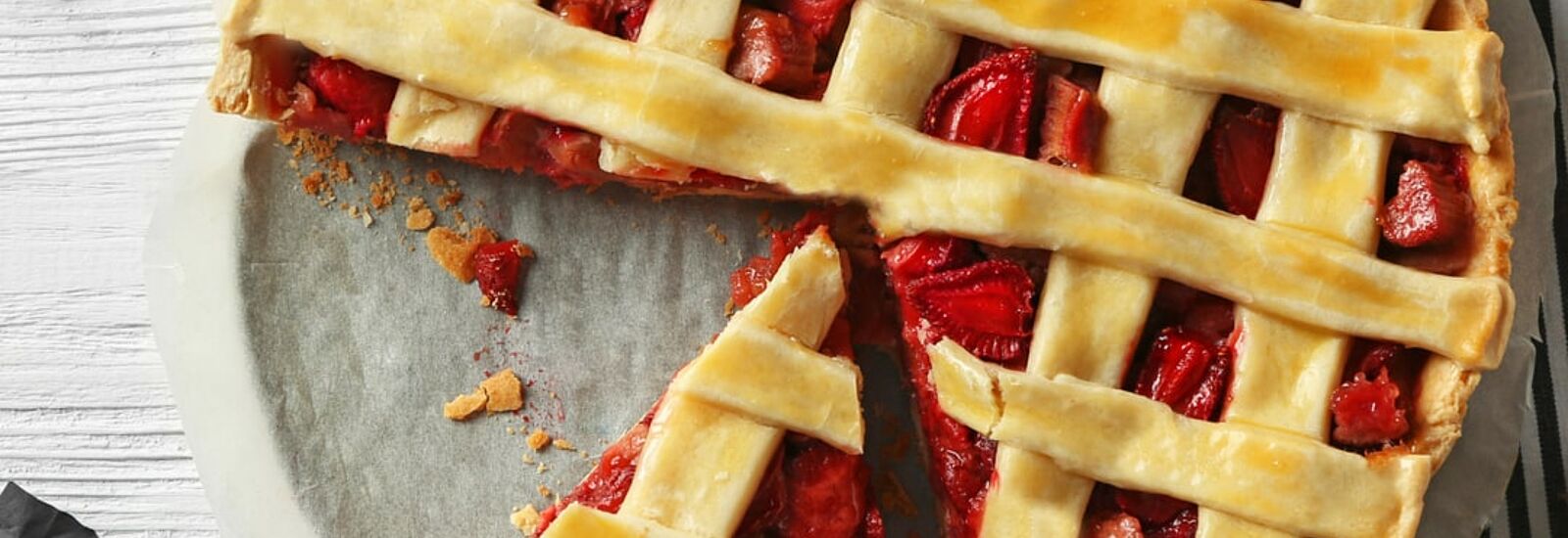 Die Rhabarber-Erdbeer-Zuckermischung mit der Speisestärke mischen und auf den Boden geben. Den Teig für das Gitter ausrollen und in Streifen schneiden und als Gitter auf der Füllung platzieren. Abschließend das Eigelb mit etwas Wasser verdünnen und das Gitter damit bestreichen. Den Kuchen im Ofen für ca. 1 Stunde backen. Gegebenenfalls nach ca. 45 Minuten für die restliche Backzeit mit Alufolie abdecken.