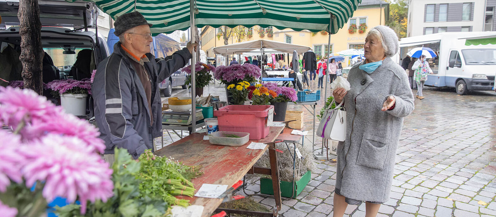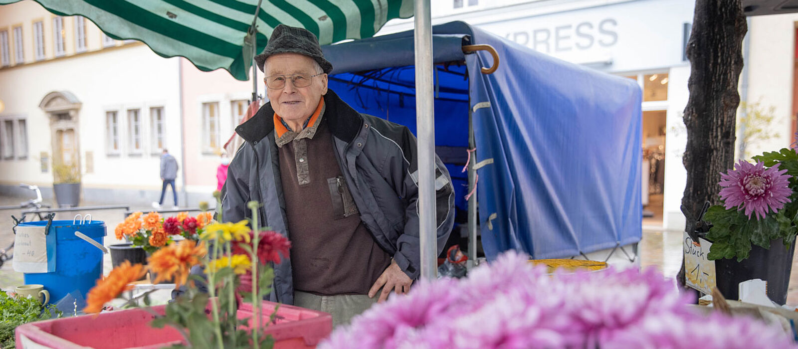 Einige Meter weiter steht ein älterer Herr mit Hut und Brille. Er grüßt freundlich, wenn jemand sich für seine Waren interessiert. Aus einem großen, gut 20 Liter fassenden blauen Plastikeimer bietet er bereitwillig Kostproben an. „Versuch doch mal, einfach auf die hohle Hand“, sagt er, langt mit einem langen Löffel in einen Eimer und fördert daraus ein wenig Sauerkraut. Es ist bissfest; schmeckt frisch, ein wenig nach Kümmel und Piment. Für 40 Cent verkauft Manfred Siefert, so heißt der Mann, 100 Gramm von seinem Kraut. Jeden Markttag macht er es frisch. Ein gutes Angebot, was viele der Marktbesucher zu wissen scheinen, denn kurz nach zehn Uhr ist sein großer Eimer zur Hälfte geleert. Alles, was er an seinem improvisiert wirkenden Stand diesen Herbsttag anbietet, stammt aus seinem eigenen Garten: von den Kartoffeln und der Petersilie bis hin zu den Schnittblumen. Mit seinen 82 Jahren gehört er dabei zu den ältesten Händlern des Marktes.